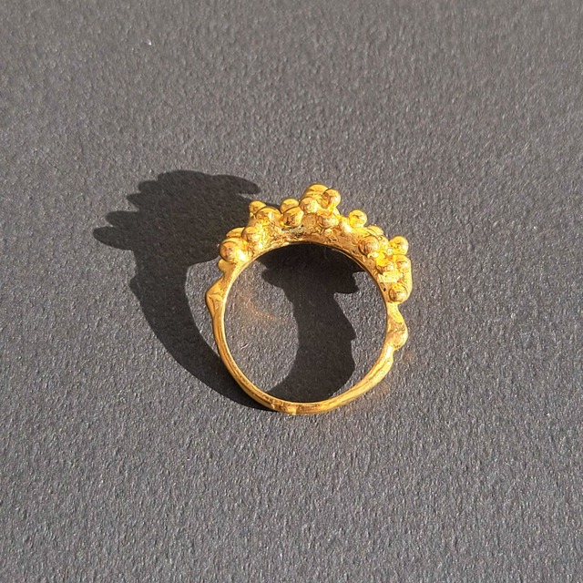 泡のような粒が積み重なった真鍮の指輪です。 蝋から原型を作り鋳造した、世界にひとつのアクセサリーになります。 手にした方の傍らにわずかでも彩りを加えることができれば幸いです。 注意事項 ・金属アレルギーをお持ちの方は、ご自分の症状に合わせて購入をご検討ください。金属アレルギーを理由とするキャンセル・返品には対応いたしかねます。 ・写真と実物では、色味などに若干の差があります。写真は参考としてお考えください。 ・真鍮は経年変化を楽しむことができる素材ですが、皮脂や汗、化粧品に触れると変色することがありますので、使用後は柔らかい布で拭くことをおすすめします。