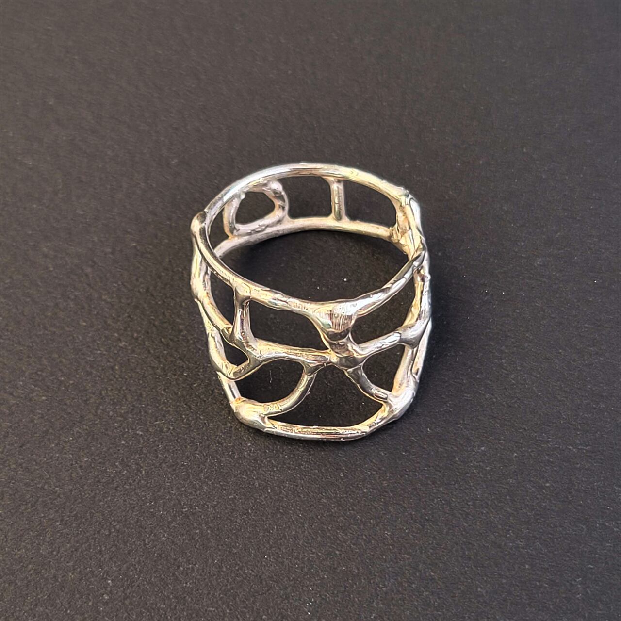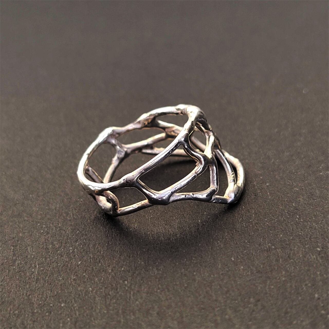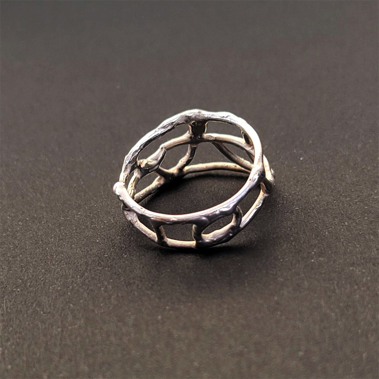 揺れる水面のようないびつで不揃いなラインを描く、14号の銀の指輪です。