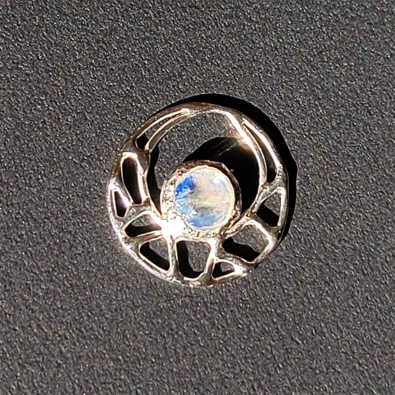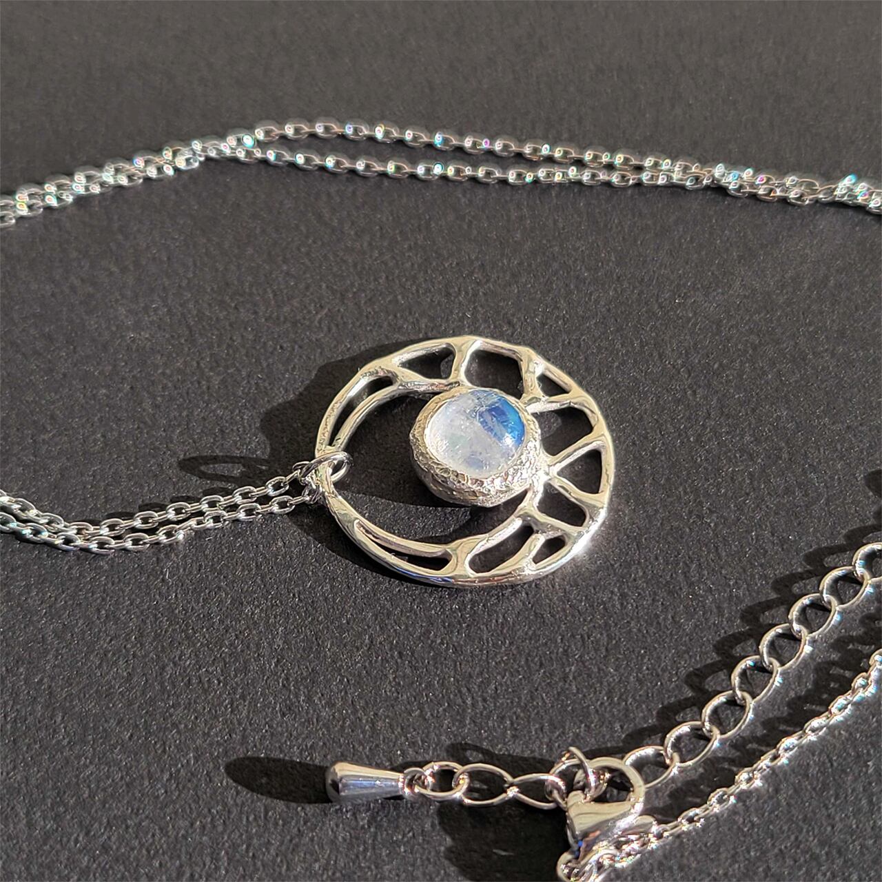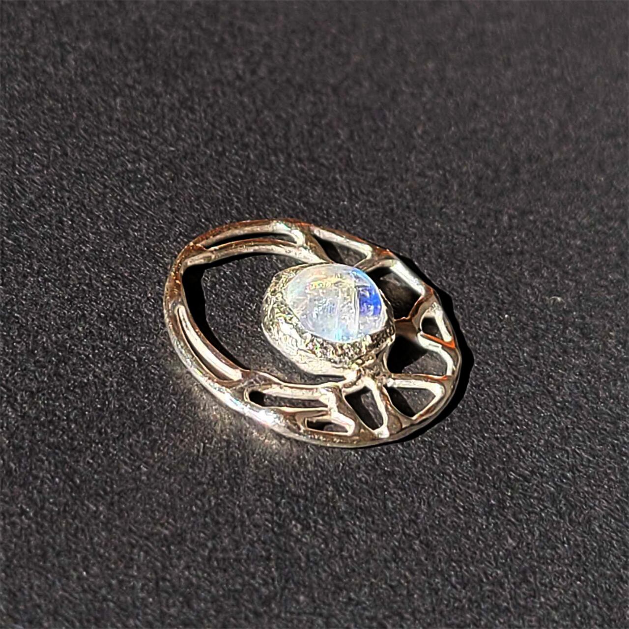 レインボームーンストーン(アンデシンラブラドライト)を留めた、ひびわれ模様の入った三日月のような、銀のペンダントトップです。
